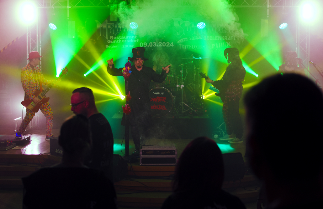 Am vergangenen Wochenende feierte ein Herzensprojekt seine zweite Auflage – ‚Meddal für’n Schäddel‚. Das Metal-Event fand erneut im großen Saal des Restaurants Günthersdorf statt. Die Veranstaltung ist noch ein kleiner Geheimtipp für Metalheads in der Region Halle und Leipzig. Das Konzept befindet sich jedoch auf dem Weg, sich einen Namen zu machen und sich in der Szene zu etablieren! Als Teil dieses spannenden Projekts haben wir von WKH Audio Service leistungsstarke Veranstaltungstechnik für ‚Meddal für’n Schäddel‘ bereitgestellt. Weiterhin haben wir auch umfassende Unterstützung bei der technischen Umsetzung der Auftritte geleistet. Unsere Verantwortung umfasste die Realisierung der Konzerte gemäß den Anforderungen der Bands, die Programmierung des Lichts sowie die Schaffung eines passenden Bühnenbilds.“
